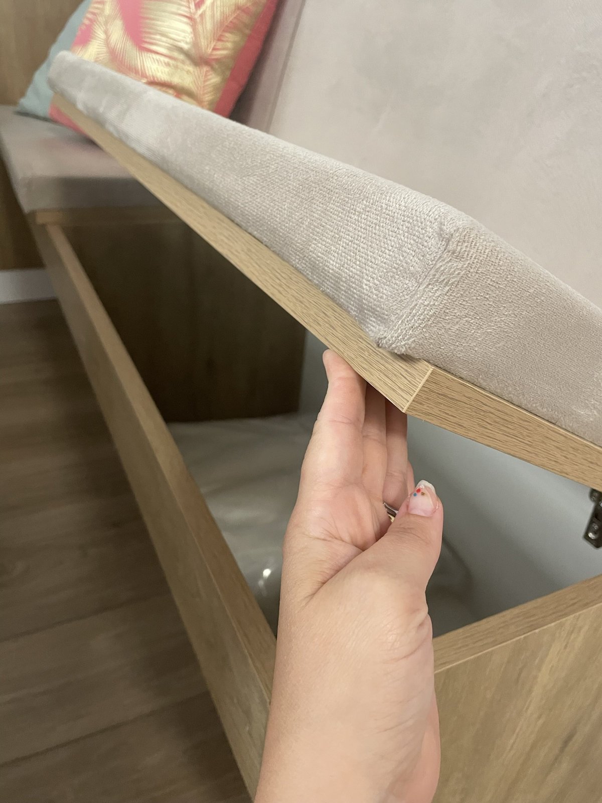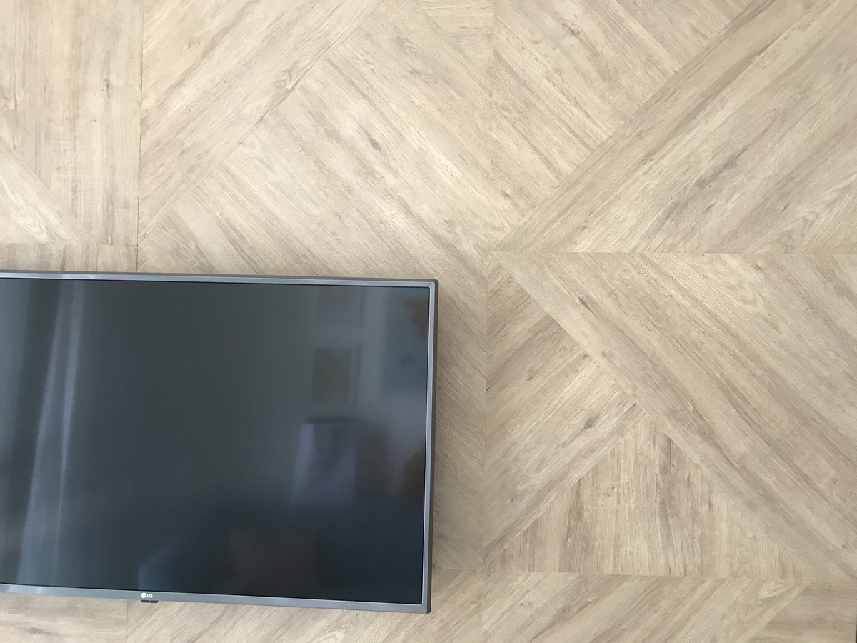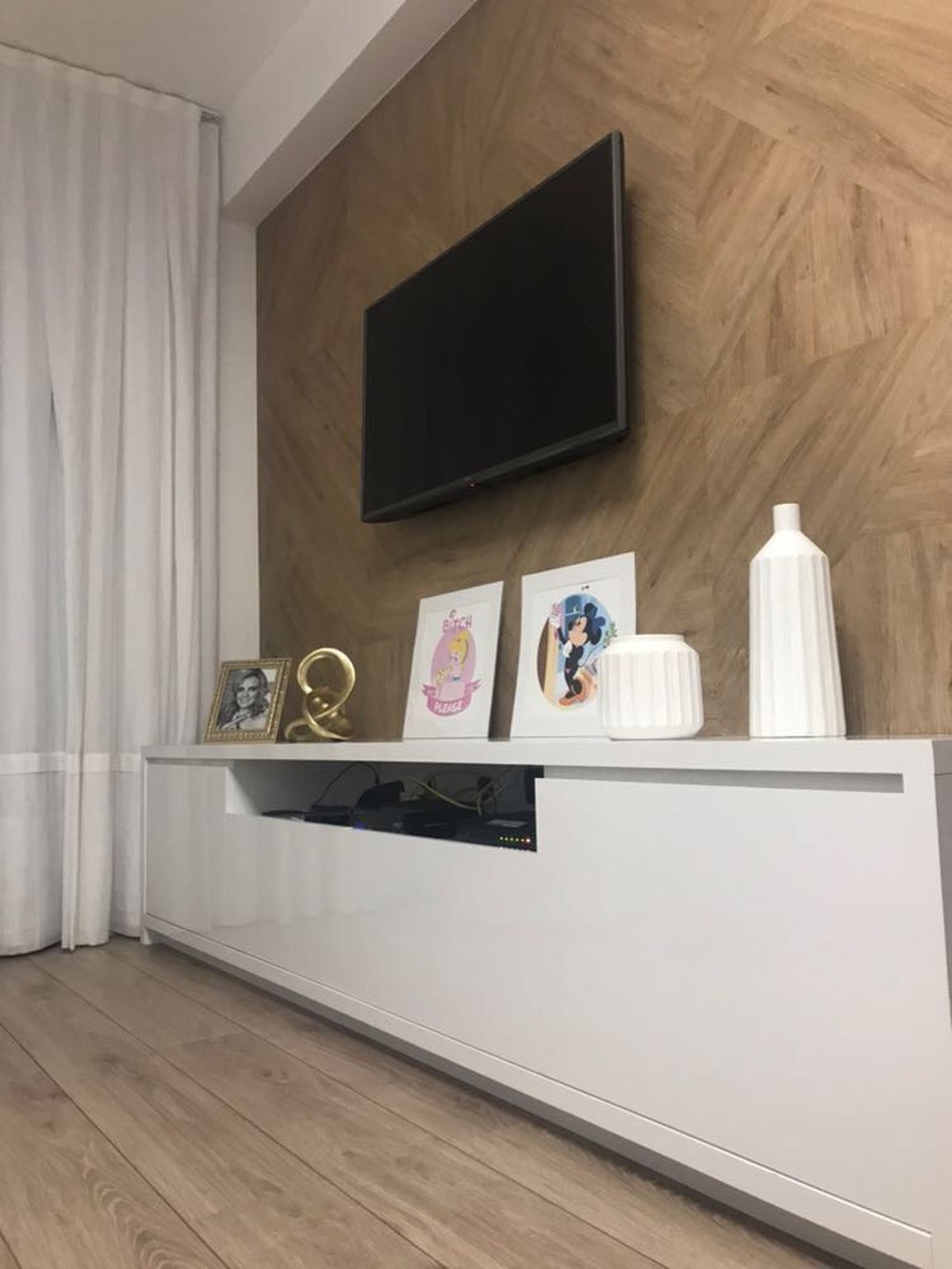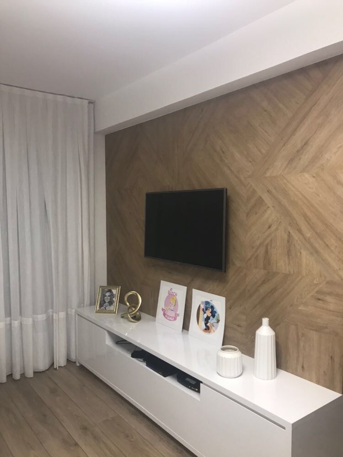 O painel de televisão é um dos pontos que chama atenção no apartamento, feito em mdf colocado em vários sentidos, criando um mosaico amadeirado.