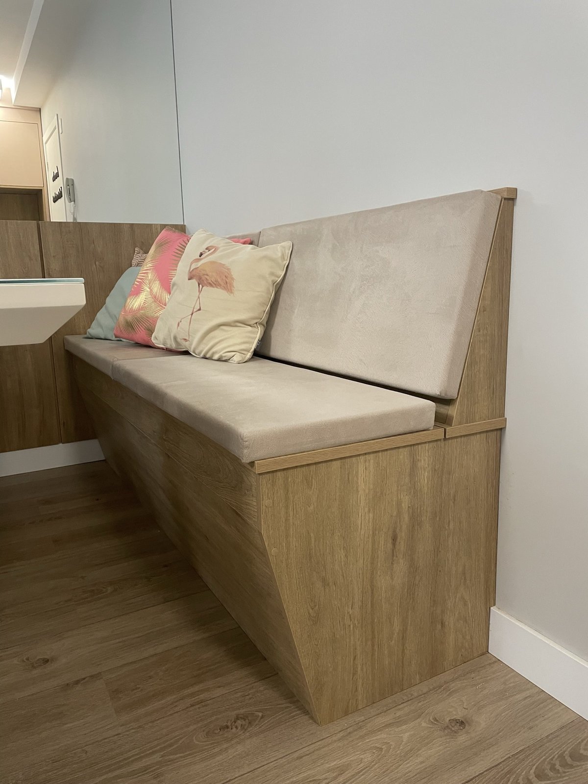A mesa em laca branca, desenhada por mim e executada em marcenaria, ganhou um banco em madeira e estofado que serve para armazenamento também.
