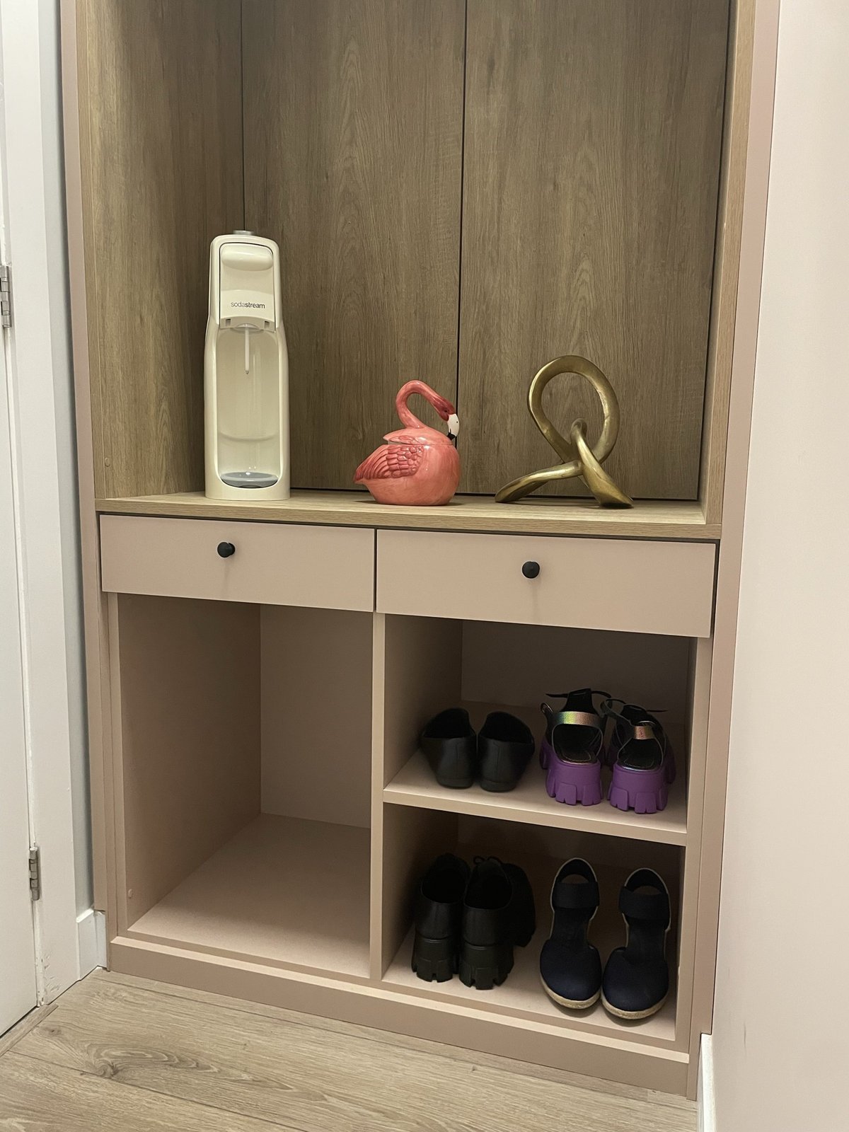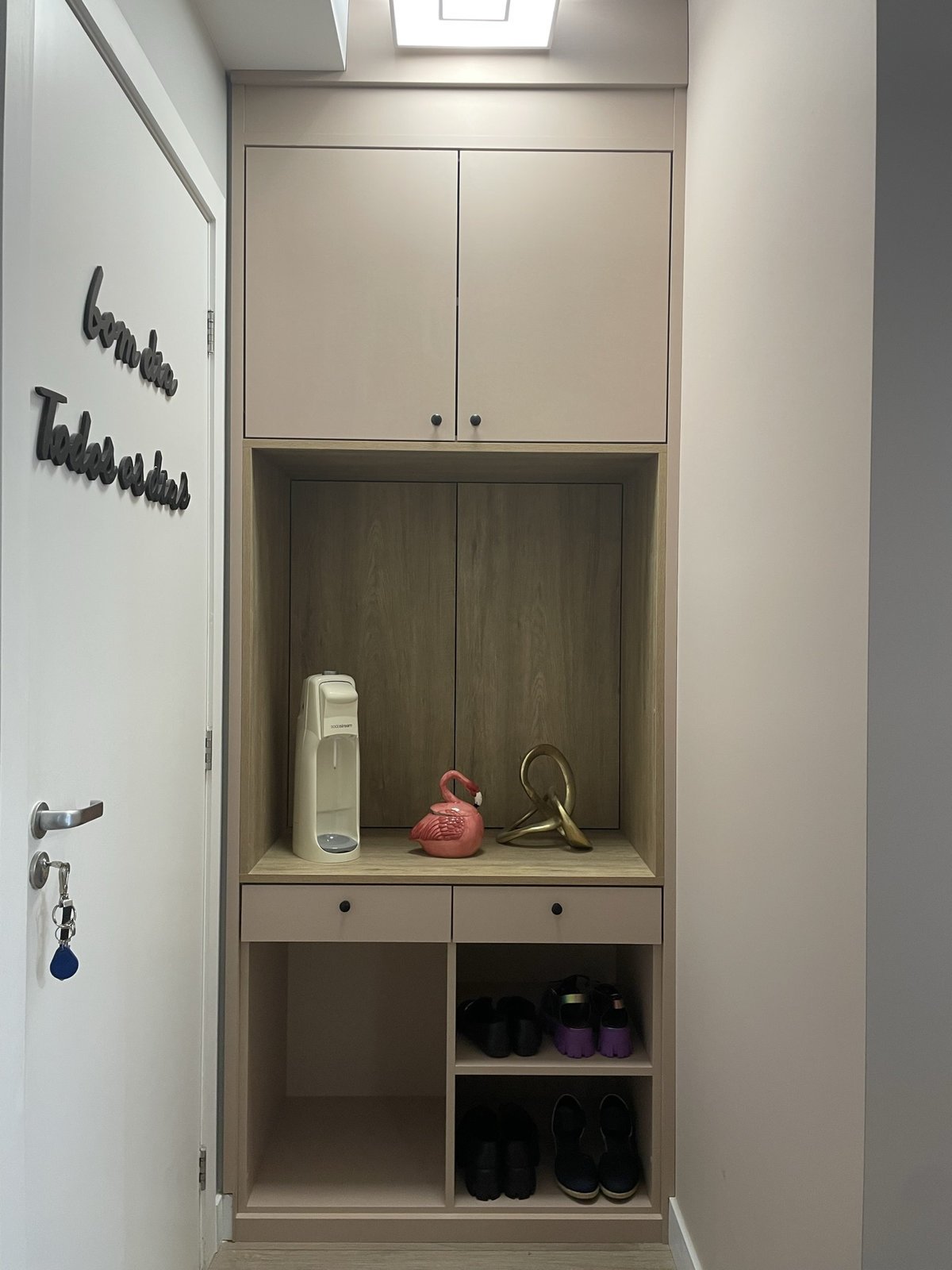 Um apartamento para uma moradora que adora cor de rosa. Este foi o ponto de partida para sala e sacada, começando lá pelo hall, que atrás da porta abriga um móvel para bolsa, sapatos, correspondências e ainda esconde o quadro de energia do apartamento.