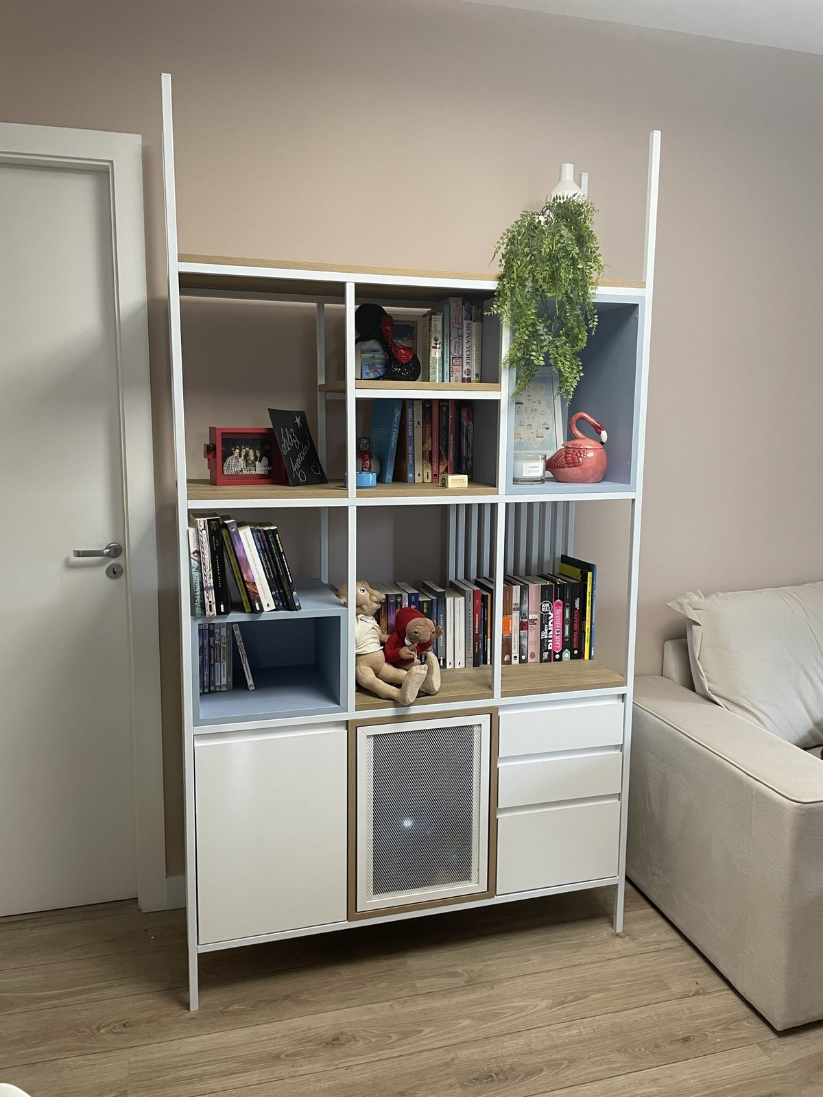 Uma estante em metalon branco e mdf azul claro é o local de livros, jogos e enfeites.