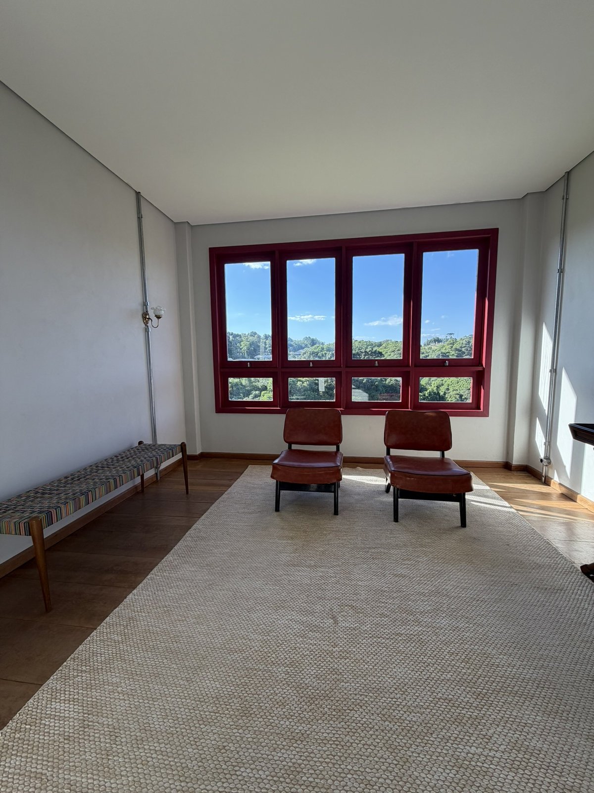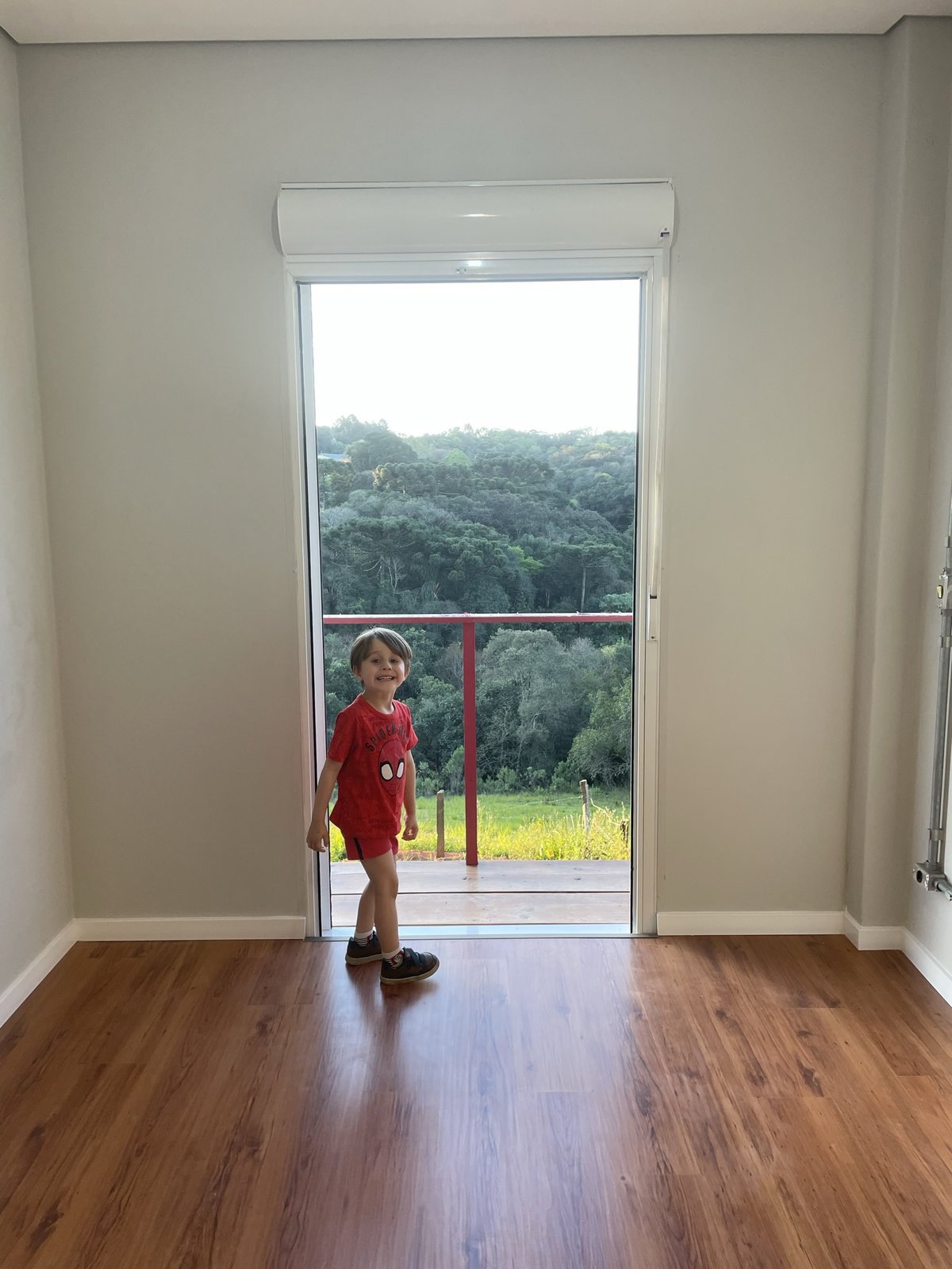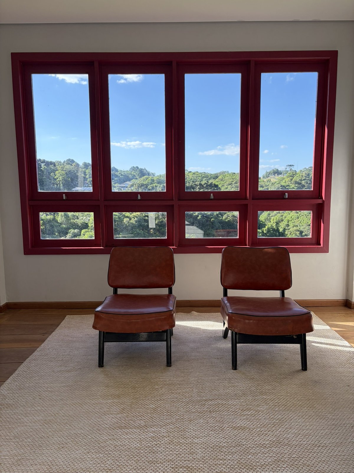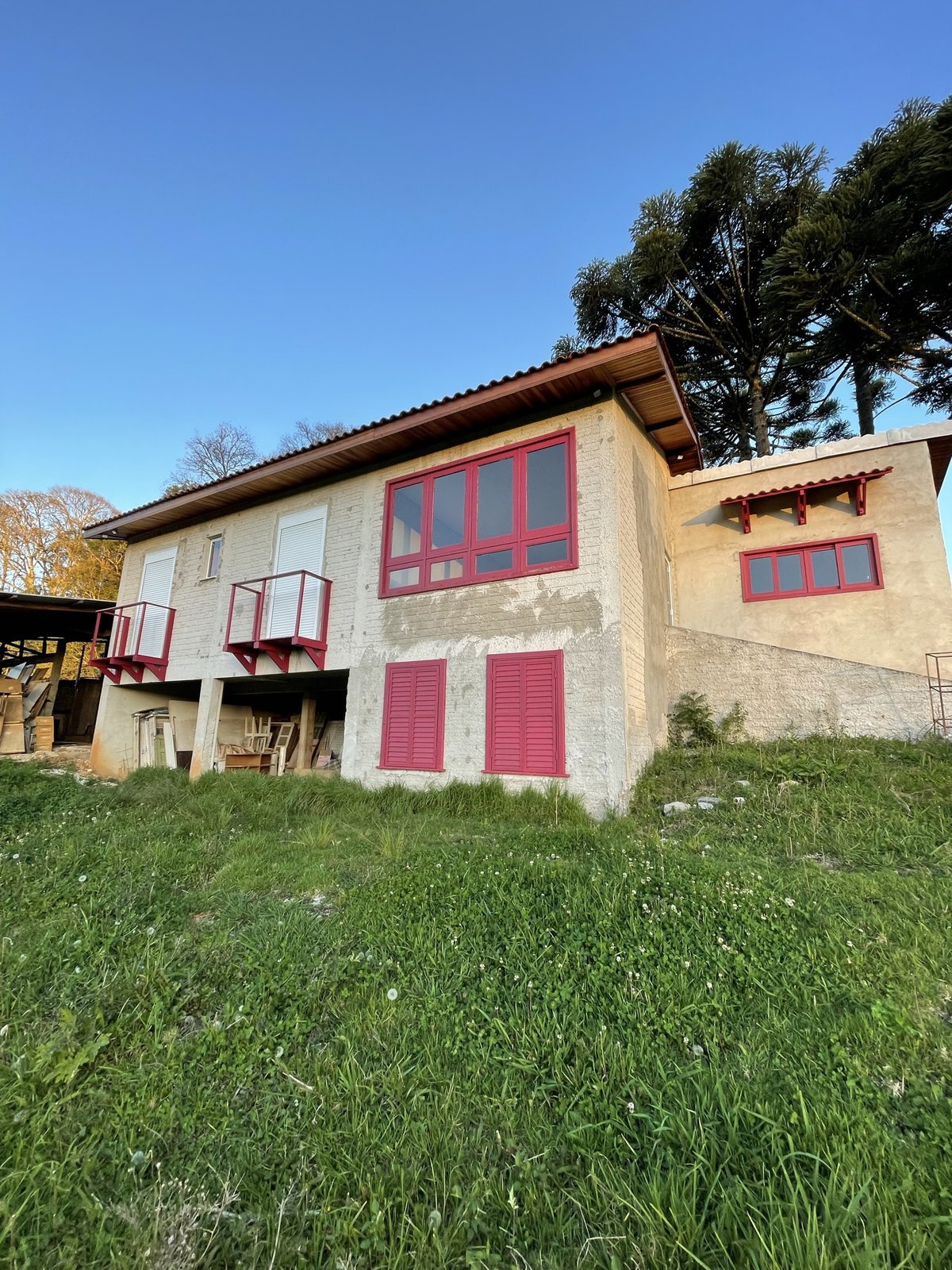 Mantivemos a estrutura e telhado e fizemos dessa casa, de dois andares, um mirante para o campo. Localizada em uma chácara em Campo Largo, esta casa foi pensada para ser a moradia de uma mãe e uma filha, além da possibilidade de servir para aluguel temporário.