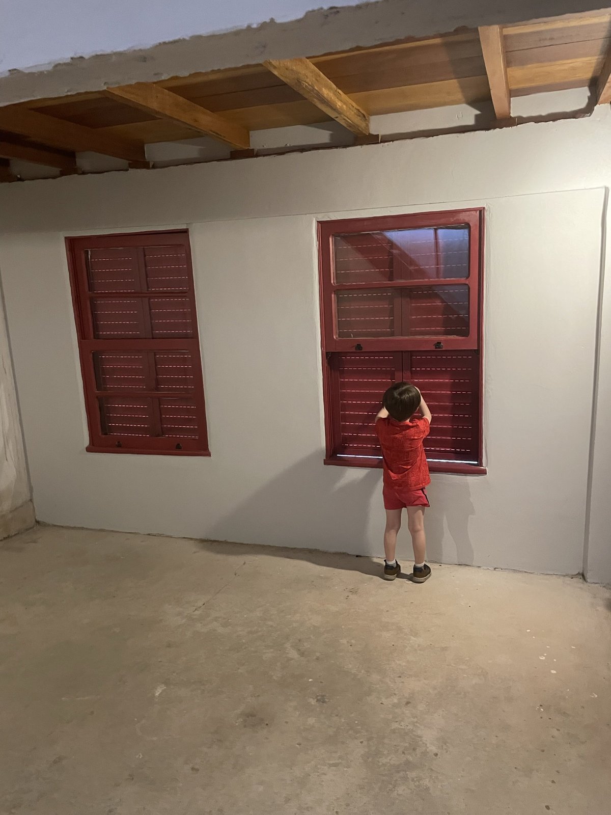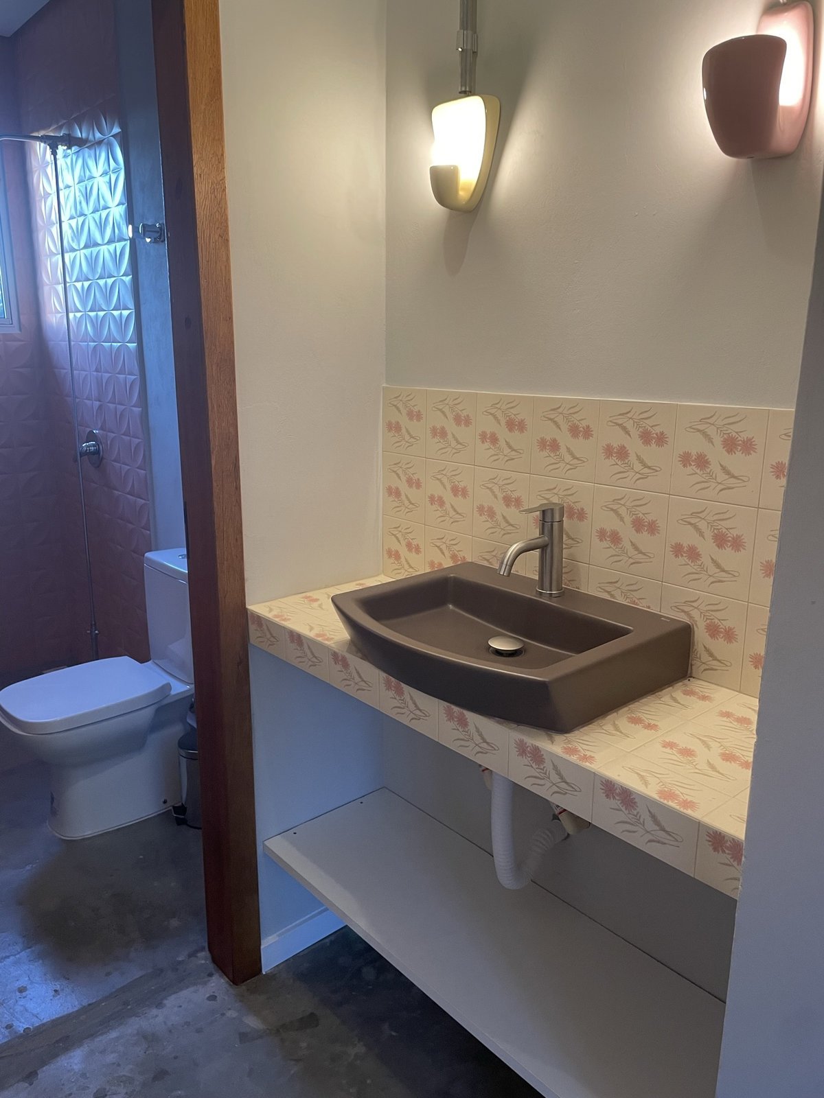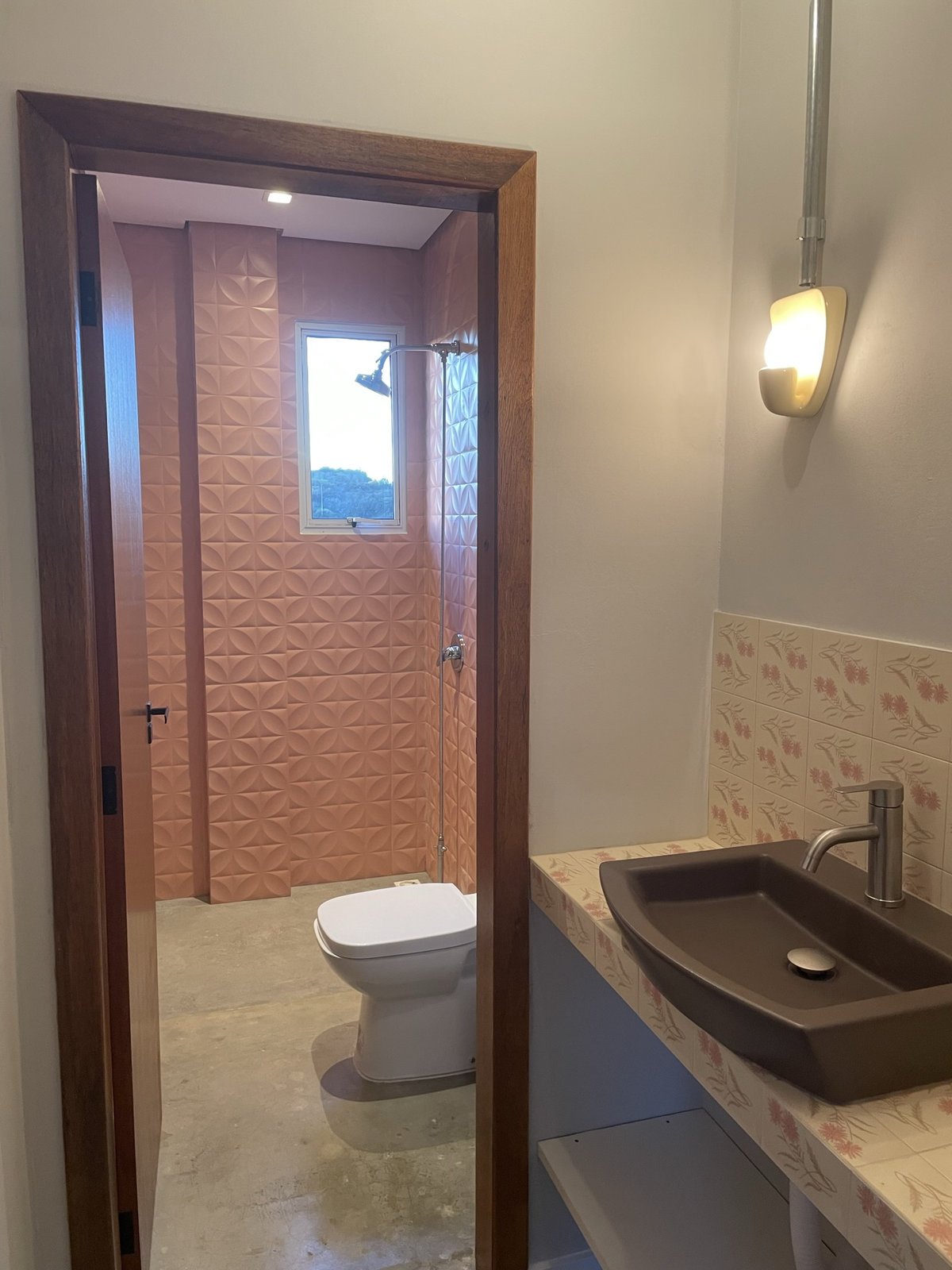 As esquadrias, retiradas de uma casa no litoral e trazidas para a casa, foram pintadas em um vermelho cereja que deu personalidade à casa. Revestimentos de parede e louças reaproveitadas também foram usados no banheiro, que fica entre os dois quartos.