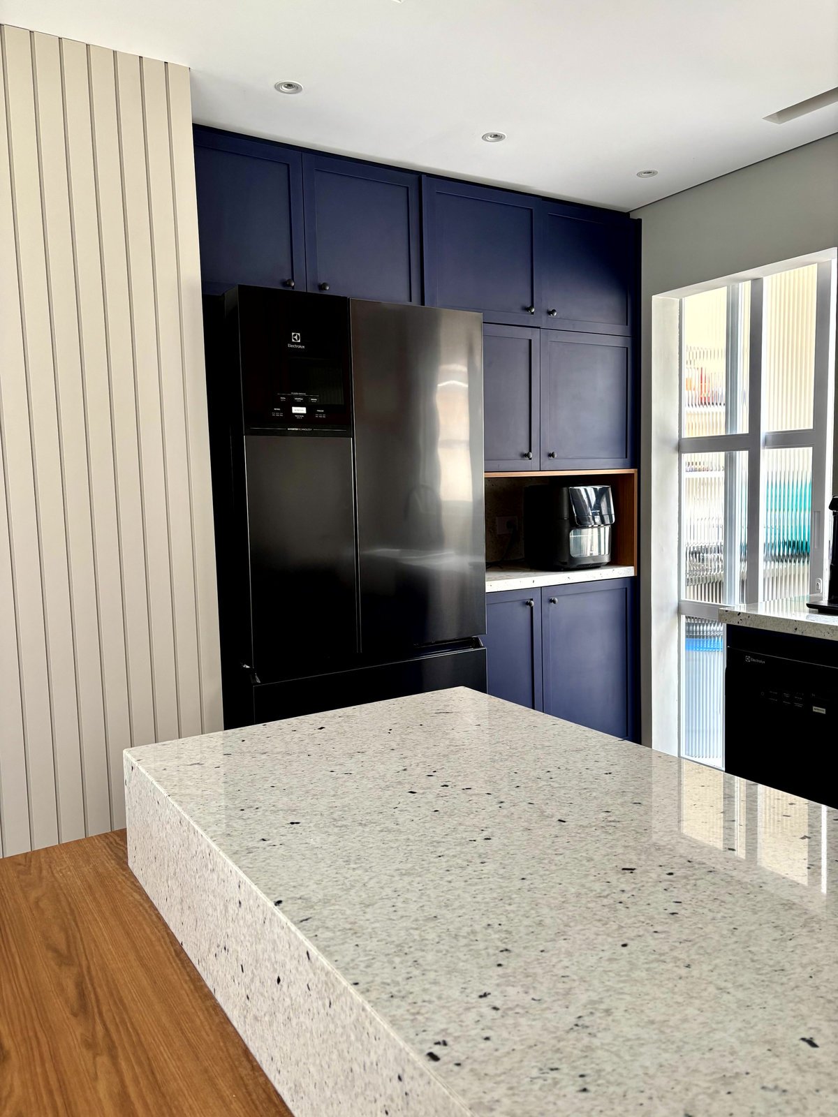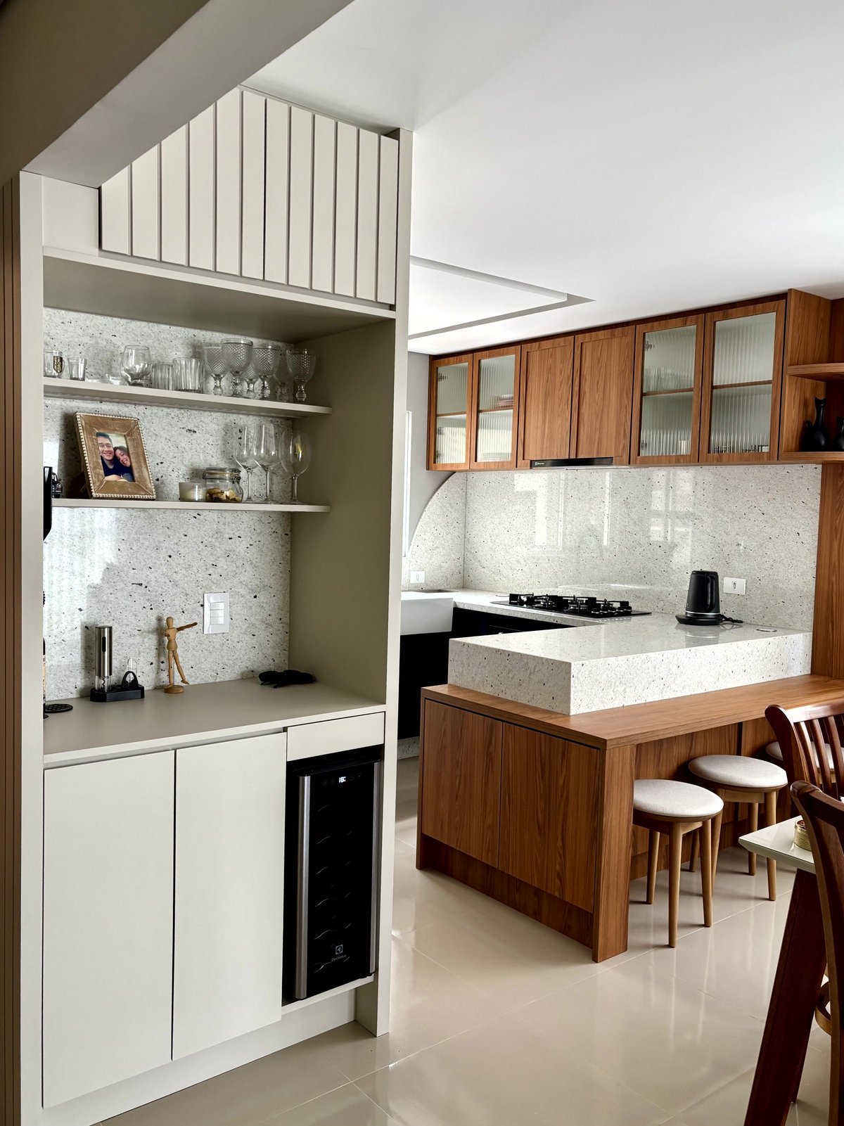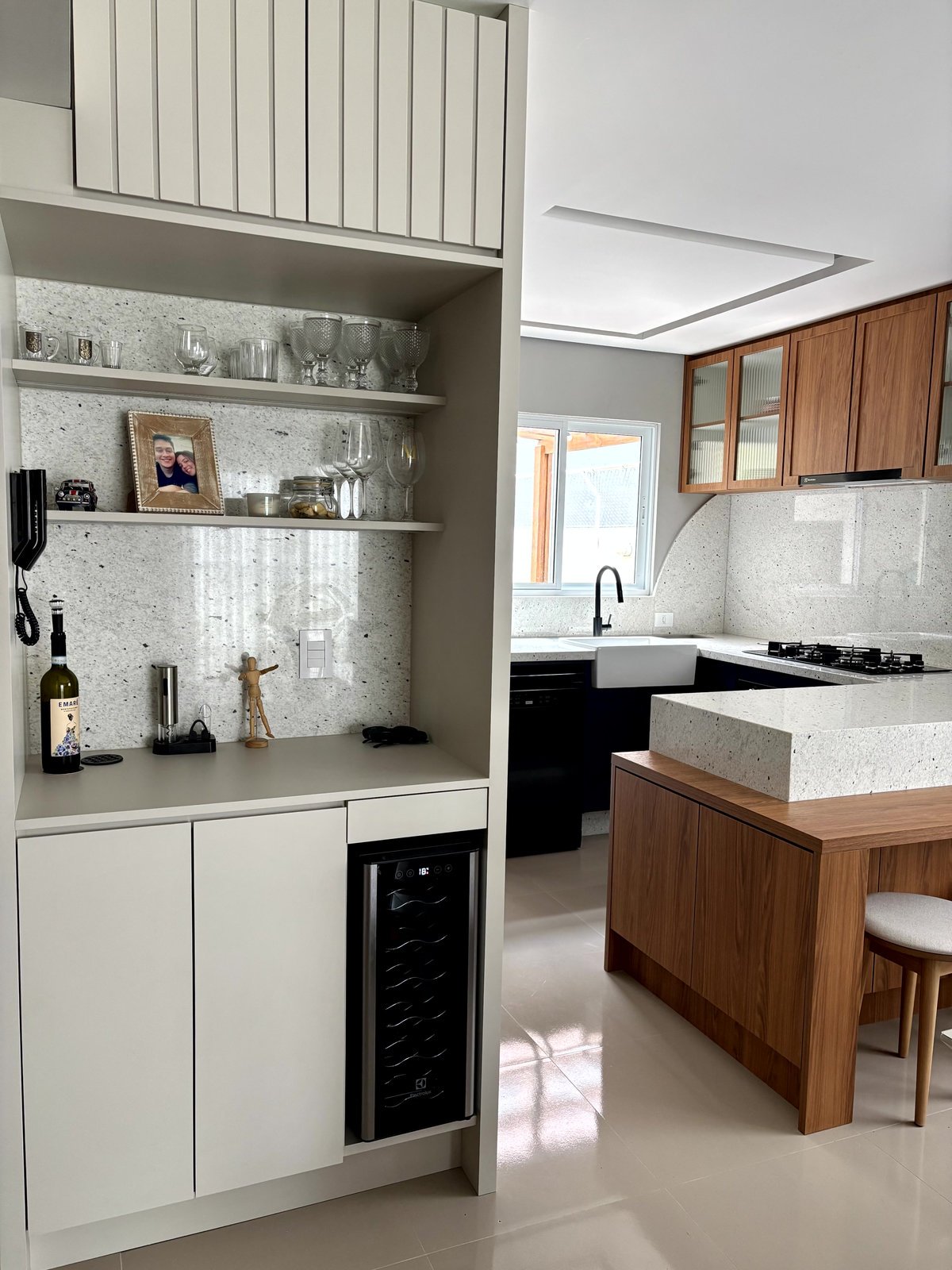 Não fica só na cozinha, o mobiliário segue na circulação criando um móvel bar, no tom areia, com o fundo do nicho no granito Pitaya também. O painel ripado em areia vem da lateral do móvel bar para a parede da circulação, preenchendo esse vazio que era da casa.