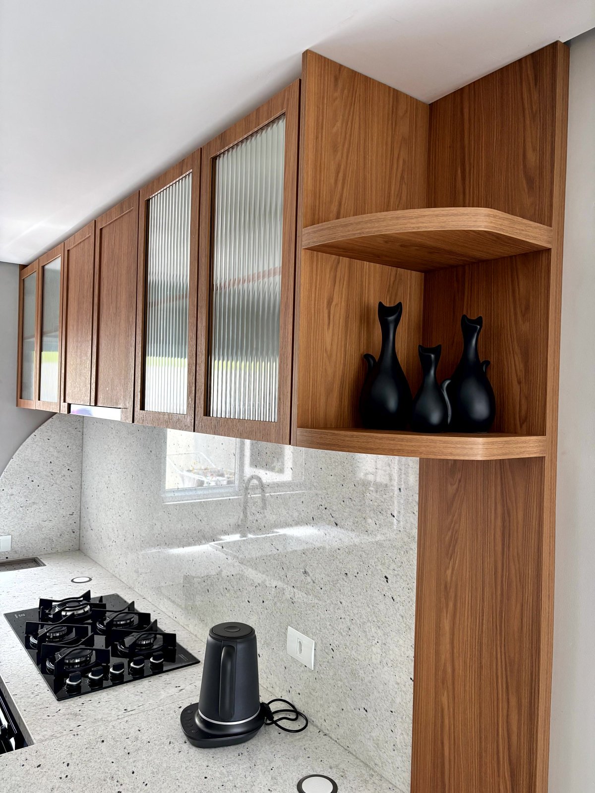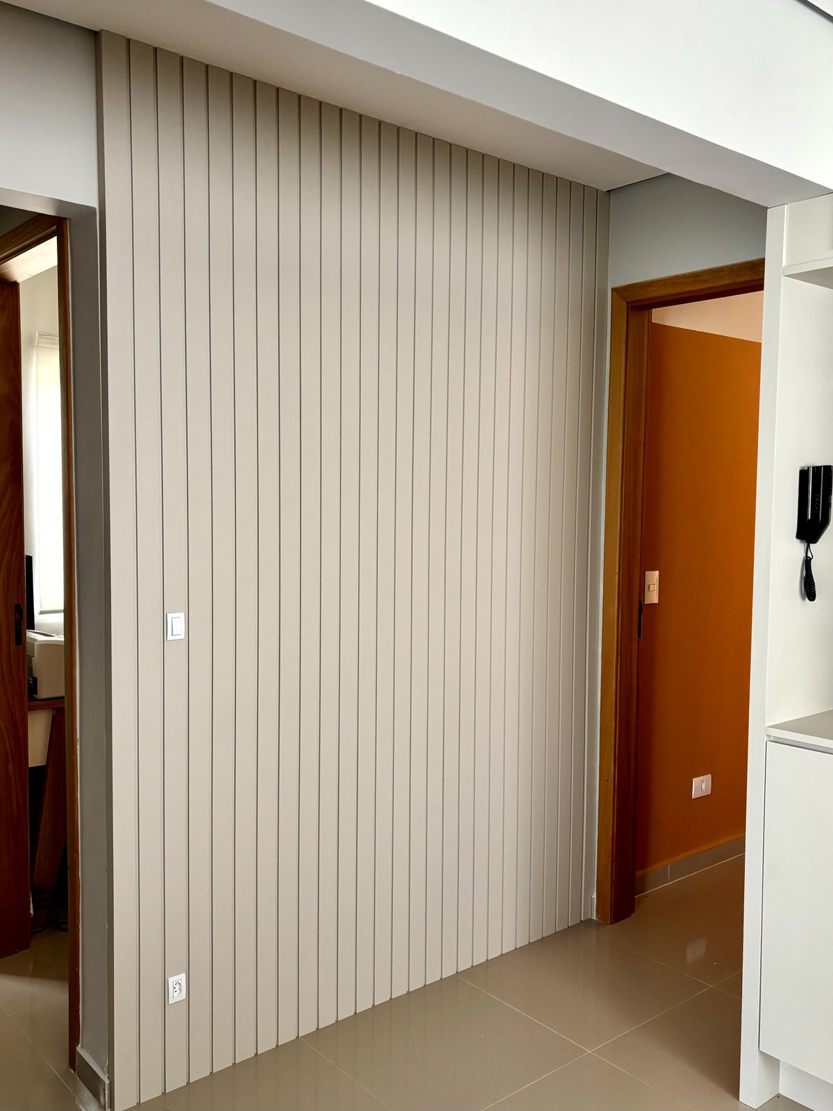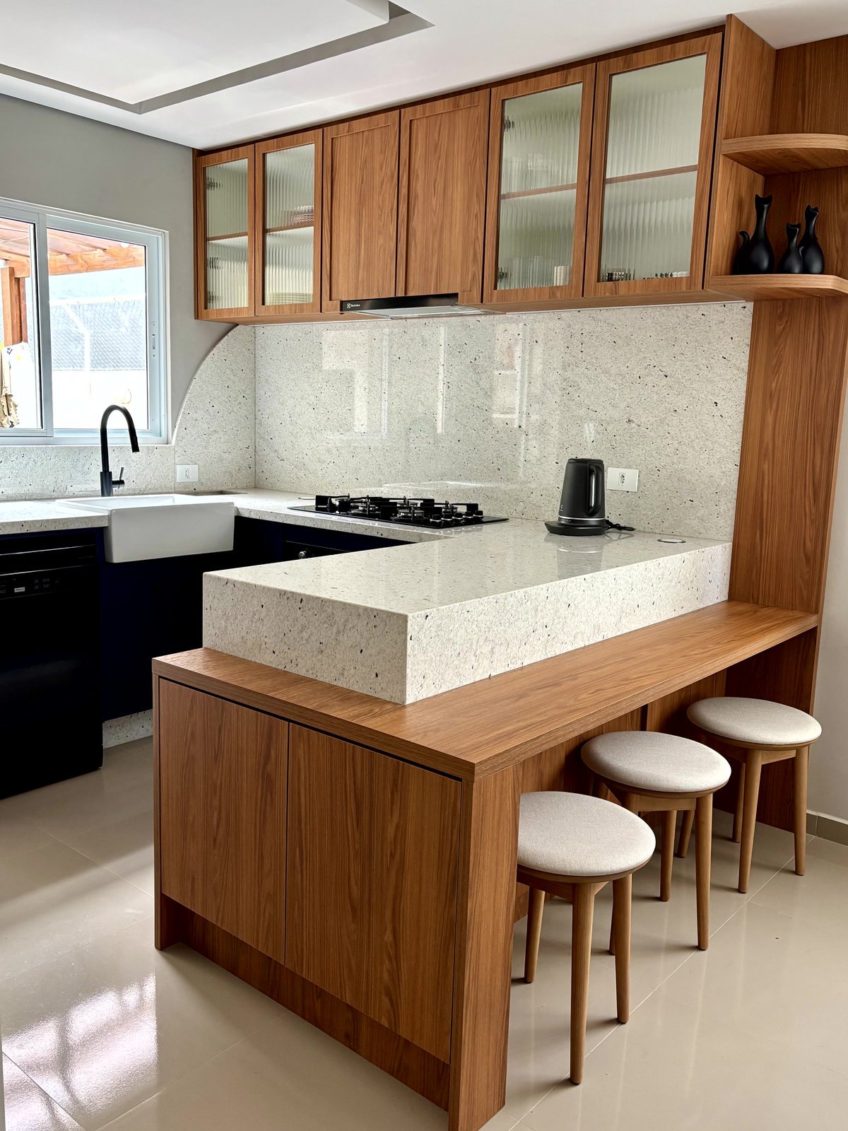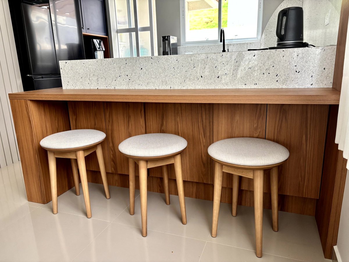Não fica só na cozinha, o mobiliário segue na circulação criando um móvel bar, no tom areia, com o fundo do nicho no granito Pitaya também. O painel ripado em areia vem da lateral do móvel bar para a parede da circulação, preenchendo esse vazio que era da casa.