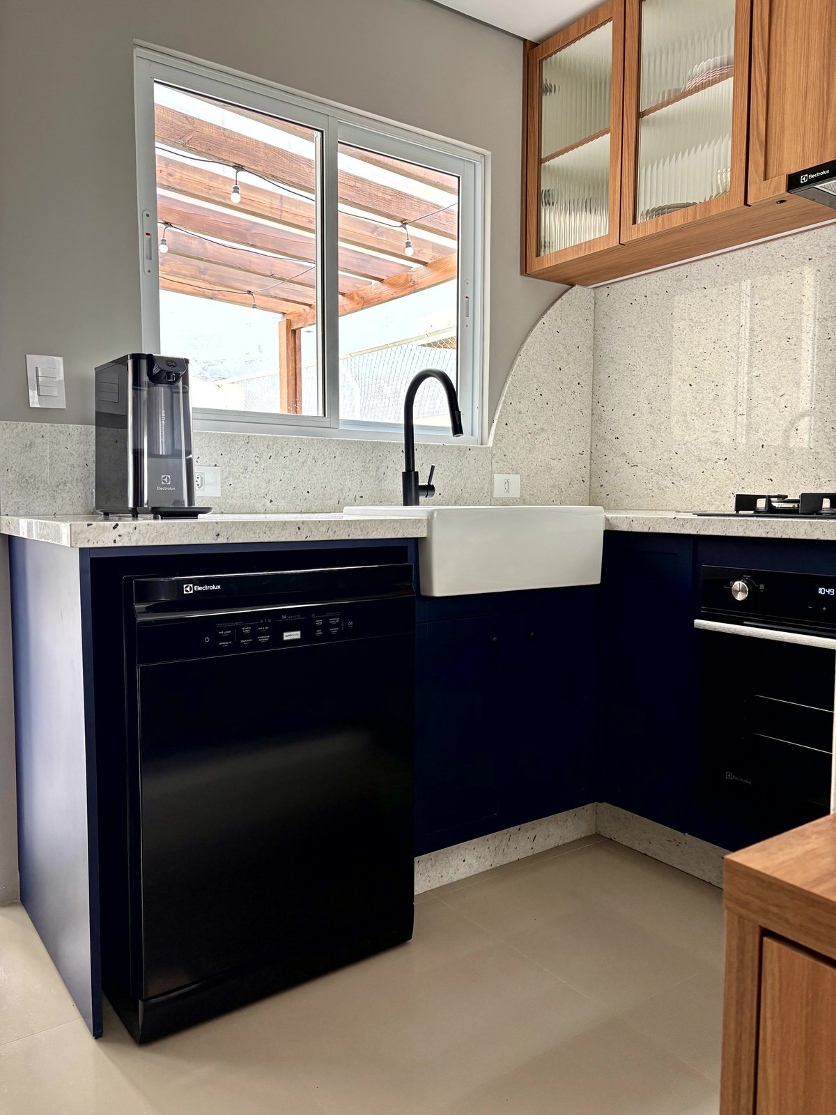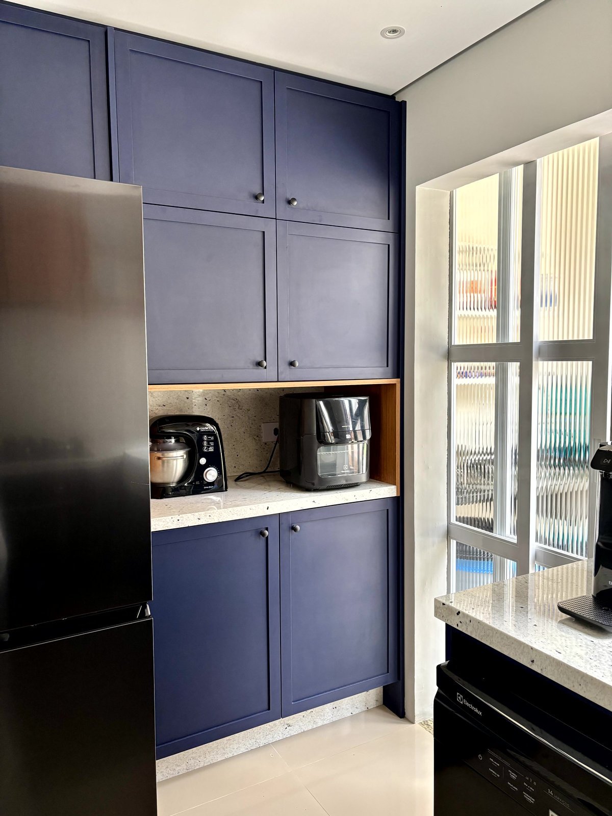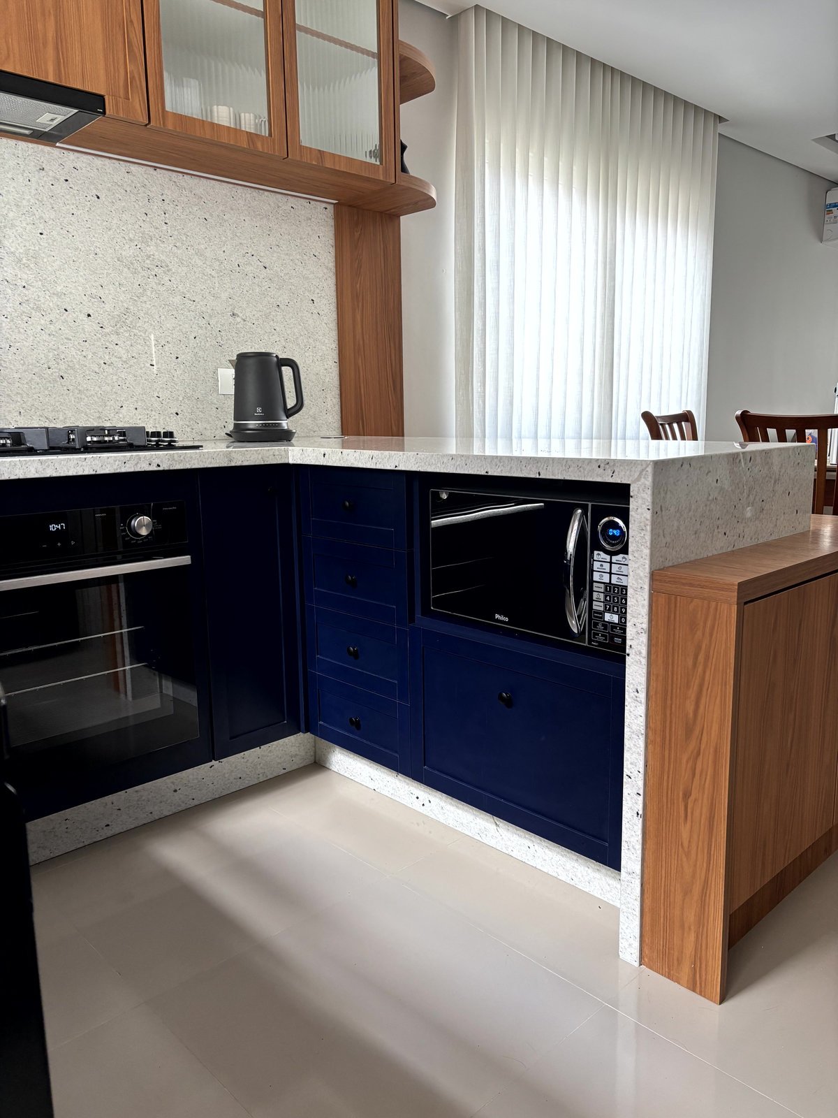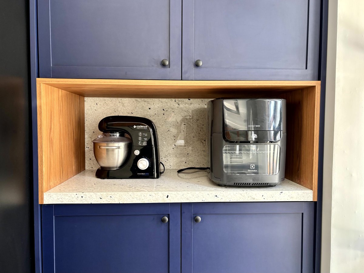 Esta cozinha faz parte do ambiente de entrada desta casa, juntamente com a sala e a circulação para os quartos. A intenção foi criar um mobiliário com a personalidade dos proprietários, um jovem casal. O uso do azul foi com esta intenção, e o tampo claro no granito Pitaya para contrastar com o que eles tinham anteriormente. A cor da madeira foi com a intenção de aquecer este ambiente e fazer uma conversa com as portas da casa, nesse tom de madeira mais avermelhado.