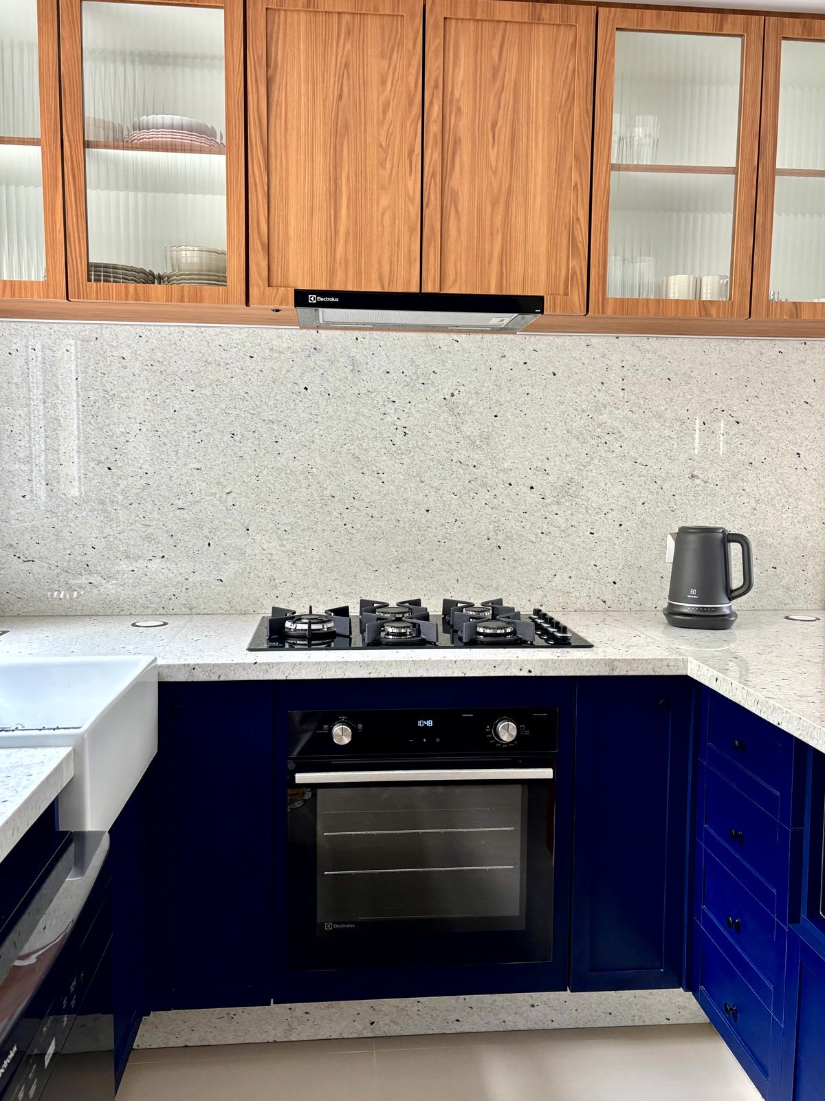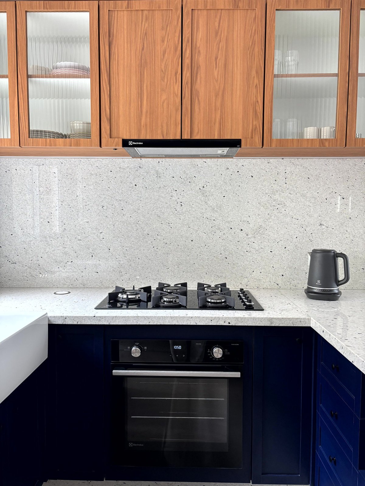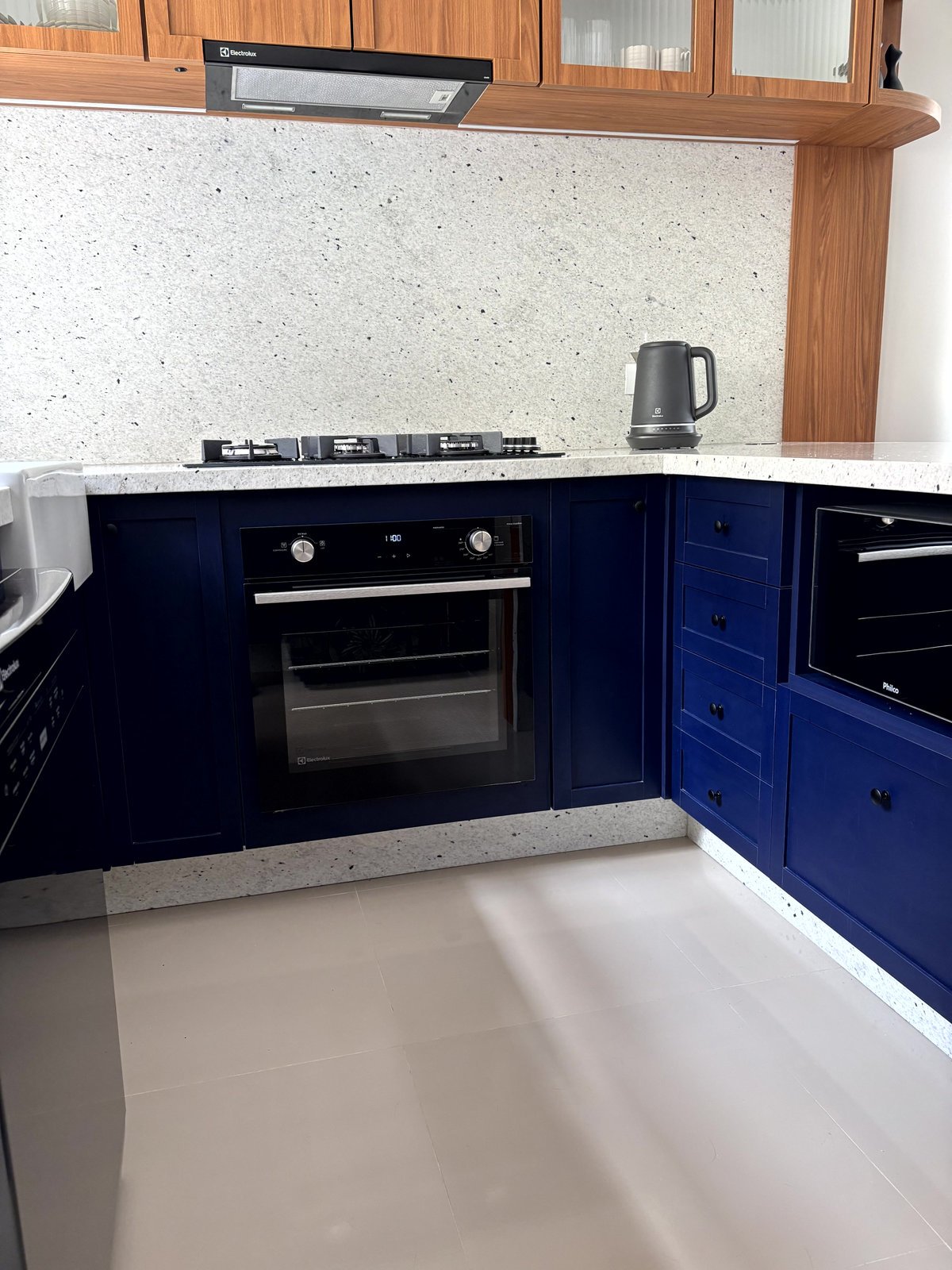 Esta cozinha faz parte do ambiente de entrada desta casa, juntamente com a sala e a circulação para os quartos. A intenção foi criar um mobiliário com a personalidade dos proprietários, um jovem casal. O uso do azul foi com esta intenção, e o tampo claro no granito Pitaya para contrastar com o que eles tinham anteriormente. A cor da madeira foi com a intenção de aquecer este ambiente e fazer uma conversa com as portas da casa, nesse tom de madeira mais avermelhado.