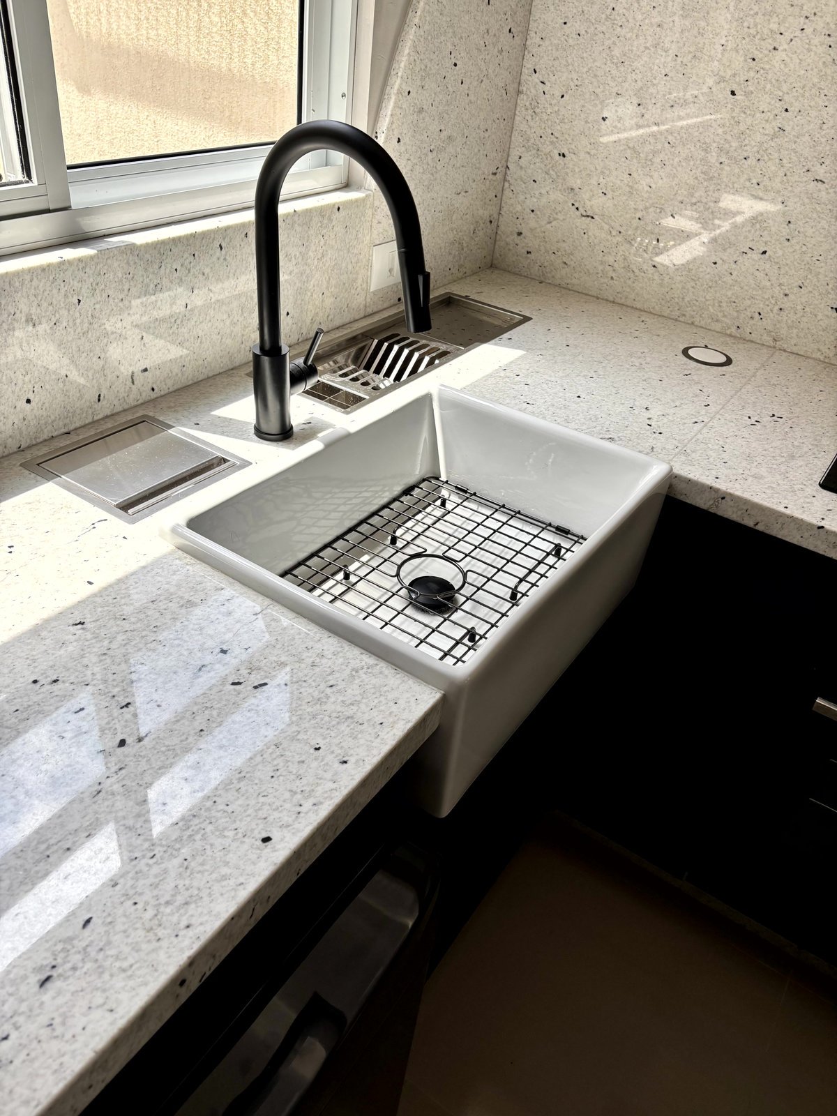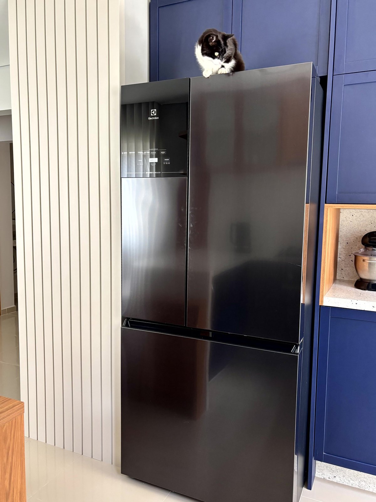 A cozinha conta com forno elétrico, forno microondas, cooktop, torres de tomada com indução, cuba estilo fazenda, nicho para eletroportáteis e geladeira 4 portas.