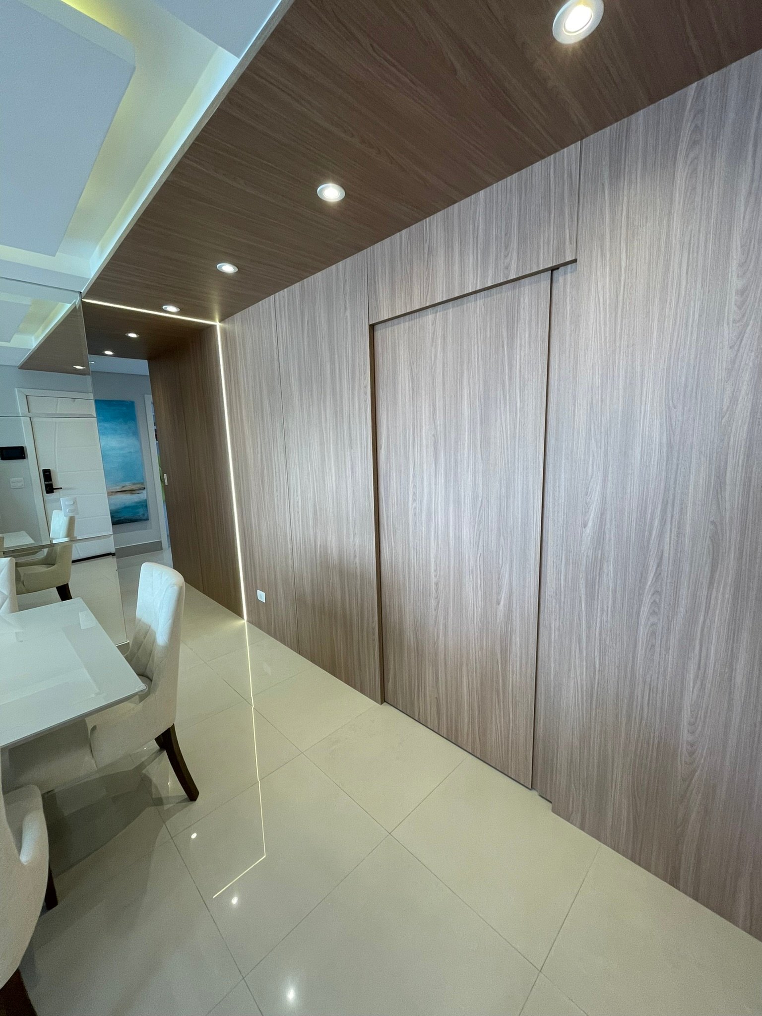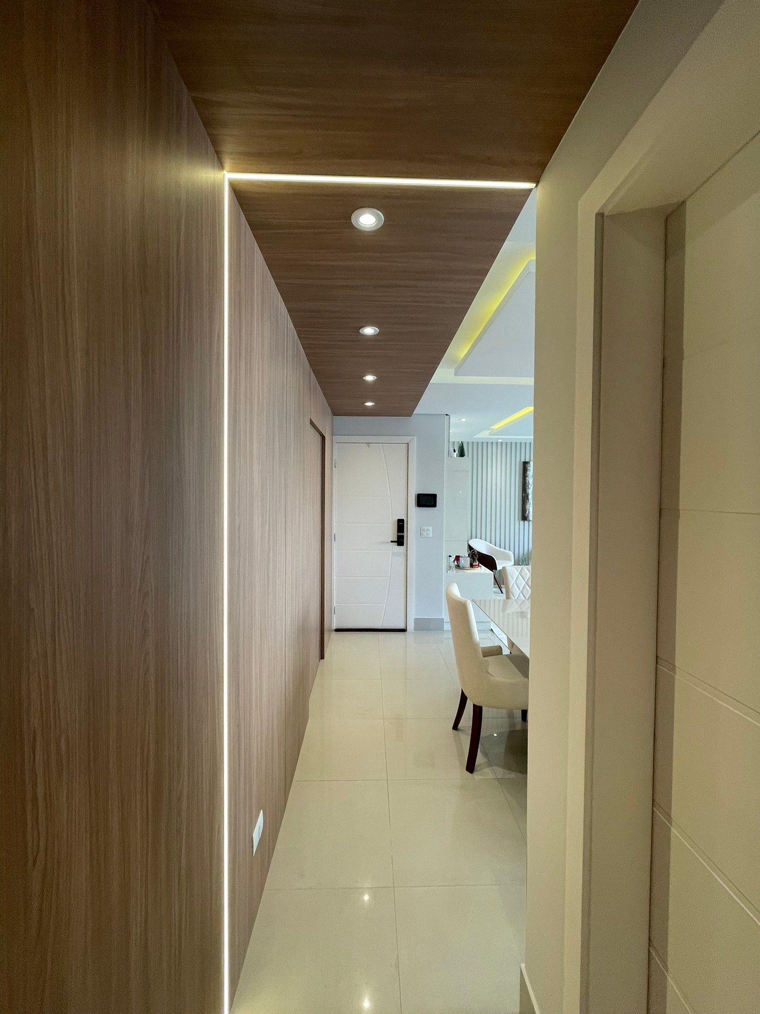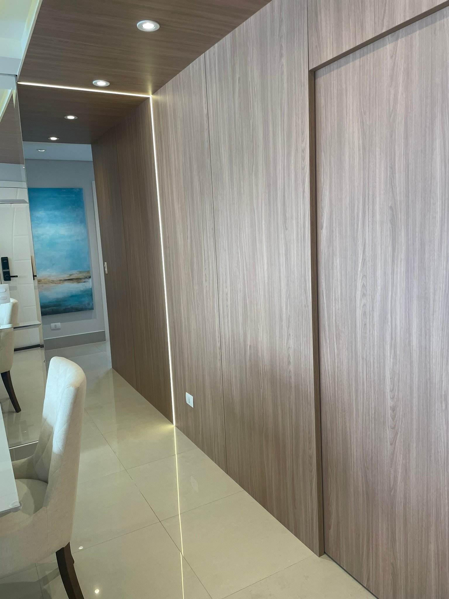 A entrada do apartamento foi o ponto que ganhou mais destaque – um painel na parede do corredor de entrada que se estende até o teto, com iluminação e a porta da cozinha de correr embutida.