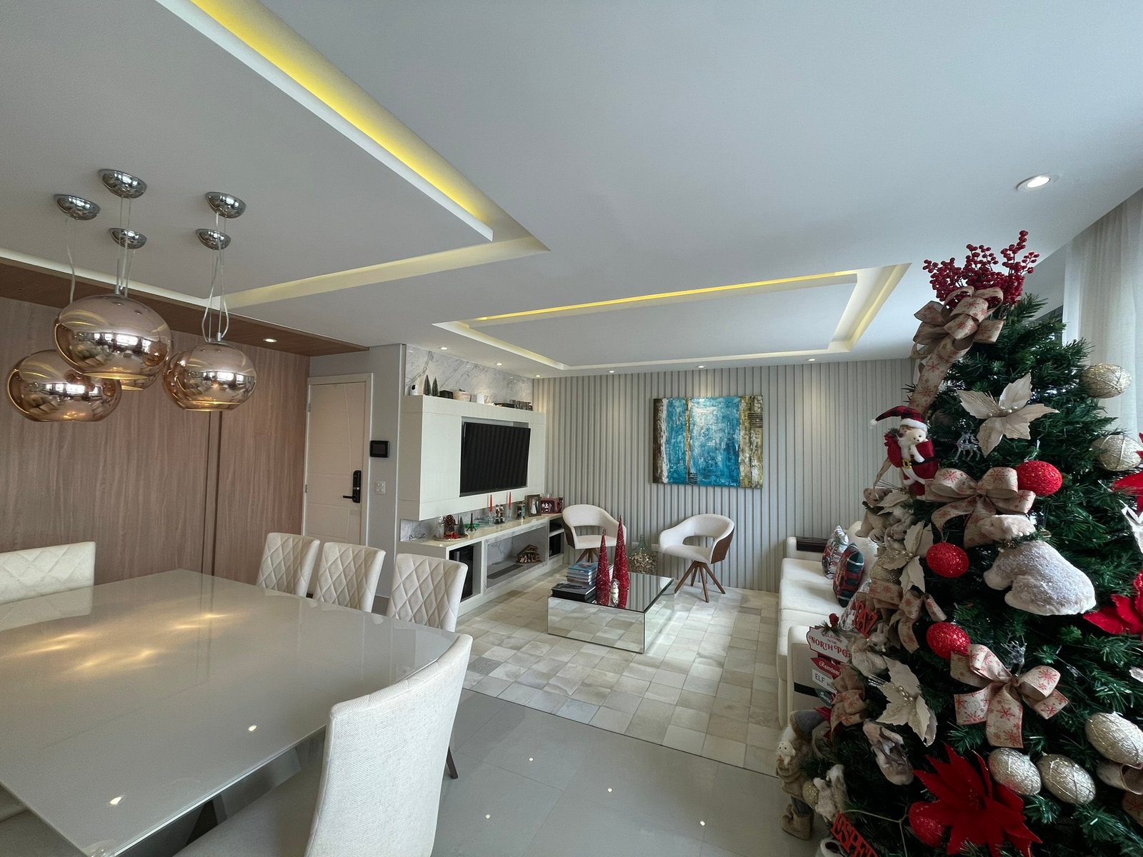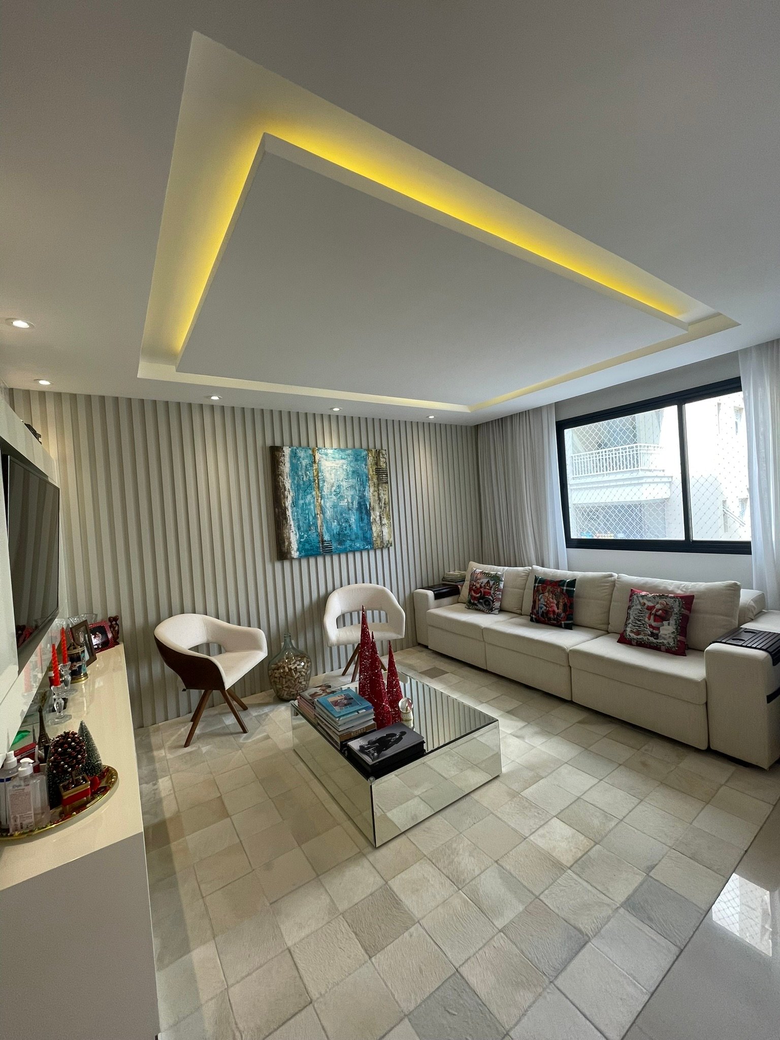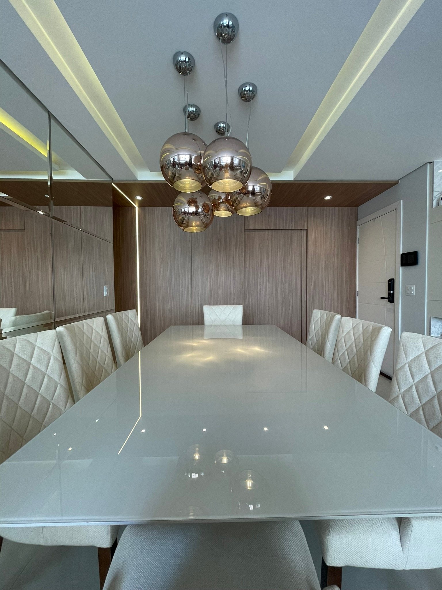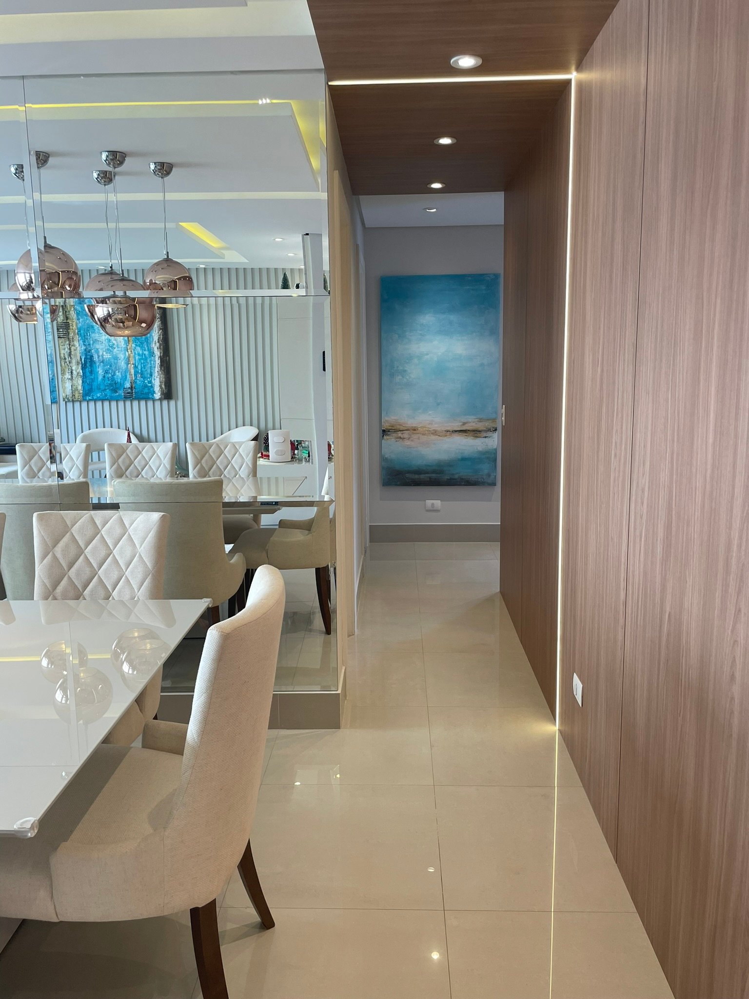 A entrada do apartamento foi o ponto que ganhou mais destaque – um painel na parede do corredor de entrada que se estende até o teto, com iluminação e a porta da cozinha de correr embutida.