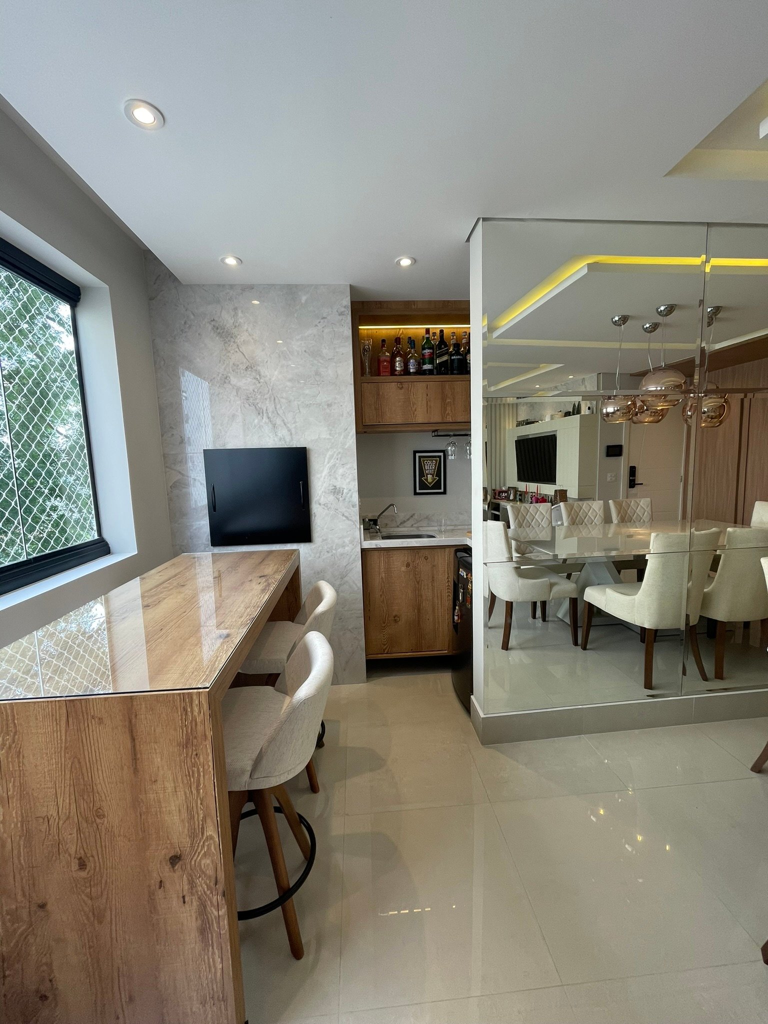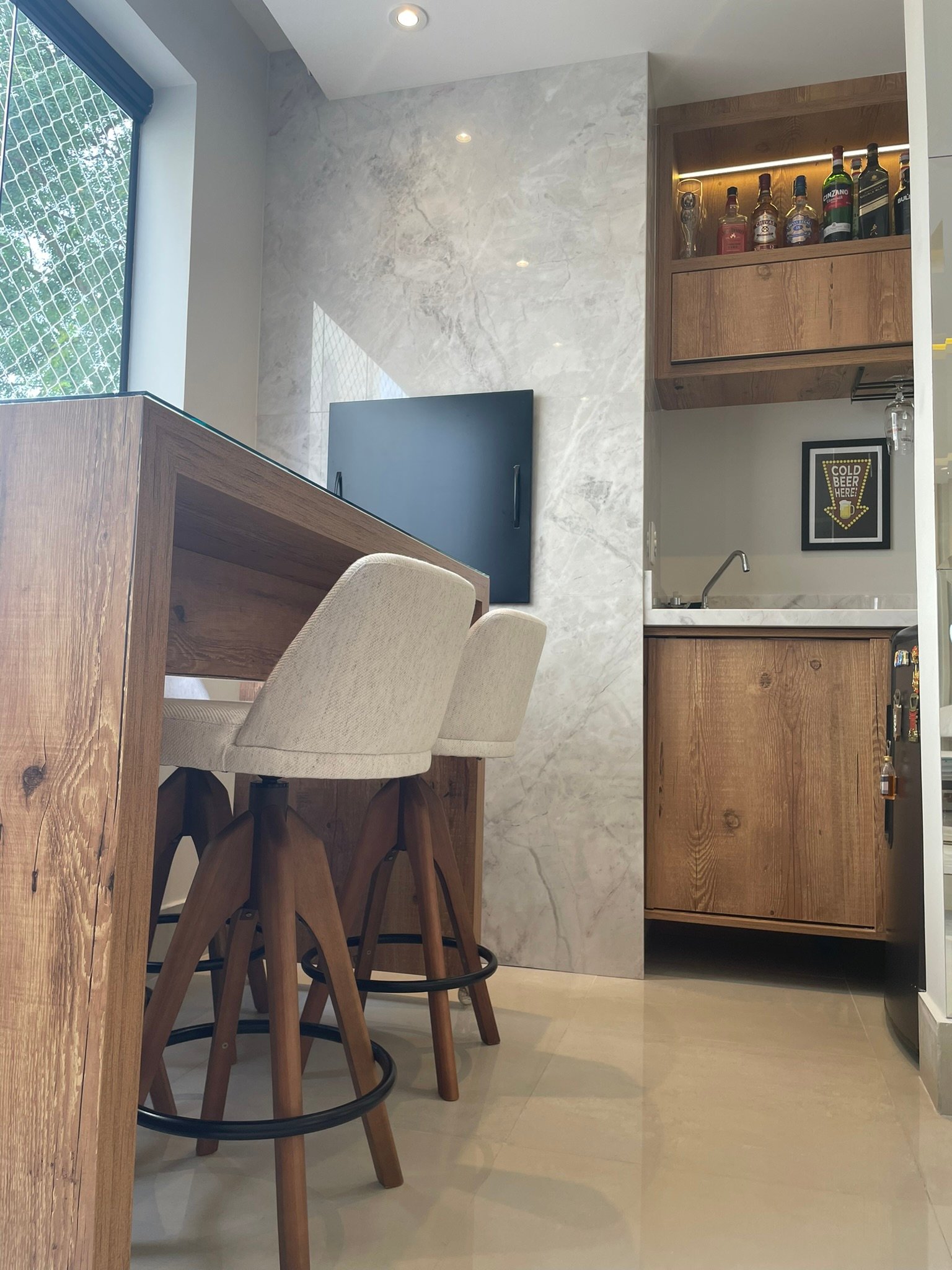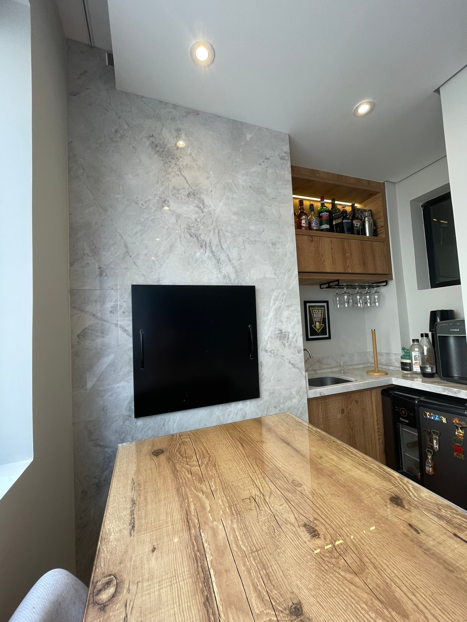Esta reforma partiu da ideia de integrar a churrasqueira, que ficava na sacada, ao ambiente da sala. Para isso foi retirada parede, esquadria e o piso regularizado e preenchido.
